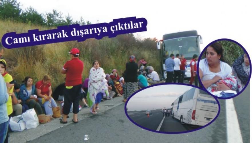 Kaza, sabah 05:30’da TEM otoyolunun Çaydurt gişelerini 3 kilometre geçtikten sonra meydana geldi. Kilis’ten İstanbul istikametine giden Şahin Karadana yönetimindeki 27 AT 190 plakalı içinde 40 yolcunun bulunduğu yolcu otobüsü, lastiğinin patlamasıyla 100 metre sürüklendikten sonra yol kenarındaki su kanalına yan yattı. Kazada 1 kişi yaralandı, yolcular ise büyük panik yaşadı. Kazada panik yaşayan yolcular otobüsün acil çıkış camını kırarak otobüsten çıktı. Yaralanan otobüs şoförü Şahin Karadana 112 acil ekipleri tarafından Köroğlu Devlet Hastanesinde tedavi altına alındı. Sürücünün sağlık durumunun iyi olduğu bildirildi. 112 sağlık ekipleri yaşlı yolcuların tansiyonlarını ölçtü. Otobüsün muavini olayı, “Tesislerden yeni çıkmıştık. Bir anda lastik patladı. Allah’tan korkulan bir şey olmadı” dedi. Yolculardan biri yaşadığı korku dolu anları şöyle anlattı: “Lastik patlayınca uzun süre otobüs duramadı ve sürüklendi. Otobüs zor durdu daha kötü olabilirdi. Allah korudu.” Kaza sonrası yolcular başka bir otobüsle yollarına devam etti. Polis ekipleri, kazayla ilgili inceleme başlattı.