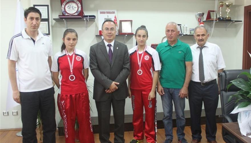 Bolu Gençlik Hizmetleri ve Spor İl Müdürü Şahin Ertem, geçtiğimiz hafta Isparta’da düzenlenen Türkiye Kick Boks Şampiyonası’nda Türkiye Şampiyonluğuna ulaşan Hatice Çakmar, Türkiye İkincisi olarak gümüş madalya kazanan Eda Nur Sevren ile antrenörleri Derviş Erdoğan ve Hakkı Koltukçuoğlu’nu makamında kabul etti. Türkiye Kick Boks Şampiyonası’nda rakiplerini geride bırakarak kürsüye çıkma başarısı gösteren sporcuları tebrik ederek ödüllendiren Şahin Ertem, 23-30 Ağustos 2015 tarihleri arasında İspanya’da düzenlenecek Avrupa Gençler Kick Boks Şampiyonasında ülkemizi temsil edecek Milli Takımda yer almaya hak kazanan Hatice Çakmar’ a, İspanya’daki organizasyon için başarılar diledi.