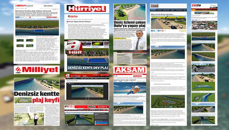 Türkiye’de birçok konuda ilklere imza atan projeleri ile ulusal basının gündeminden düşmeyen Bolu Belediyesi, son olarak Hürriyet, Milliyet, A Haber’in yanı sıra çok sayıda haber sitesinin manşetlerinde yer aldı. Milliyet Gazetesi’nde “Denizsiz kente dev plaj” Hürriyet Gazetesi ise “Bolu’ya yapay deniz geliyor” başlıkları ile Bolu Belediyesi manşetlerde yer aldı. Aynı zamanda çok sayıda haber sitesi “Bolu’ya çılgın proje” başlıkları ile haberi Türkiye’ye duyurdu.