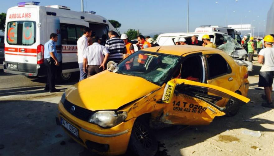 Olay, Paşaköy Kavşağı çıkışından yaklaşık 100 metre sonra meydana geldi. Metin Kosifoğlu idaresindeki 14 T 0208 plakalı ticari taksi, Paşaköy altgeçitinden İstanbul istikametine doğru çıkış yaptı. Bu sırada D-100 Karayolu'nda seyreden Lokman Aksoy yönetimindeki 14 AT 635 plakalı servis minibüsü, aynı istikamete çıkış yapan ticari taksi ile çarpıştı. Kaza sonrası yoldan çıkan iki araçta büyük çapta maddi hasar meydana gelirken, olay yerinde can pazarı yaşandı. Minibüste bulunan işçiler Masum Aksoy, Suat Aksoy, Kenan Aksoy, Ünal Aksoy, Feyzullah Aksoy, Oktay Örce, Zeki Örce ve Tayfun Örce yaralandı. İki aracın sürücüsü ile bir işçi araçlarda sıkıştı. Kazazedeler uzun uğraşlar sonucu sıkıştıkları yerden kurtarıldı.