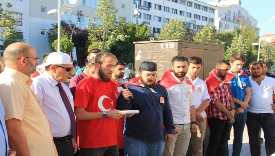 İl Gençlik Kolları Yönetim Kurulu Üyesi Harun Yıldız, dua sonrası grup adına açıklamada bulunarak, “Ne güzel bahar gelecekti memleketime, Karadeniz Dağları'nda Horon tepecek, Cudi'de halaylar çekecektik beraber… Hayalet şehir Diyarbekir... Şehirde bütün kepenkler kapalı. Gökyüzünde helikopterler, caddelerde zırhlı güvenlik araçları var. İlçelerden insanlar göç ediyor. Ne için? Bu şehirde çocukların umudu yok. Annelerin yüreği ağzında, babalar kara kara düşünüyor. Gençler yine anlamsız şekilde ölüyor. Mutlu musunuz? Bir tarafta teknesi batıp, kıyılara vuran çocuk yaşta mülteci bedenleri, bir tarafta bombalarla parçalanmış çocuk bedenleri… Yuhh bize bee.! Bugünlerde vicdanı rahat uyuyan var mıdır? Hadi yüreğiniz yetiyorsa mezara Türklüğünüzü, Kürtlüğünüzü götürün. Kimse size ırkın ne diye sormayacak. Rabbin kim diye soracaklar efendi!” Senin yazdıklarının üzerine koyacak bir şeyimiz yok Yunus. Rabbim bize, senin o büyük hayallerini gerçekleştirmeyi, Memleketimizin her yerinde barışı, huzuru ve kardeşliği hâkim kılarak, sana kıyan insanlık düşmanlarını kahretmeyi nasip etsin. Rabbim bize senin gibi ismine yaraşır bir ömür yaşamayı nasip etsin Kardeşim. Rabbim seni cennetine kabul etsin. Şehidimiz Yunus Koca’nın yanı sıra terör olayları neticesinde şehit düşen, başta birkaç gün önce henüz 13 yaşındayken şehit edilen FıratSımpil olmak üzere tüm vatandaşlarımıza ve güvenlik güçlerimize Allah’tan rahmet yakınlarına da başsağlığı diliyoruz” dedi.
