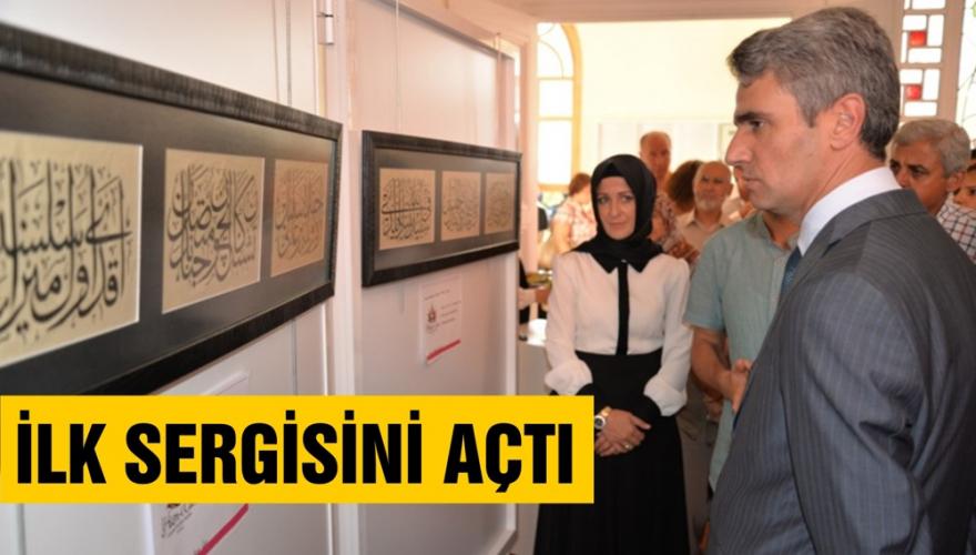 "Hüsn-i Can" Hat sanatı sergisinin açılış kurdelesini kesen Bolu Valisi Aydın Baruş, sergilenen eserler hakkında Hattate Güldane Ergin Can ve Hattat İslam Kaya'dan bilgiler aldı.