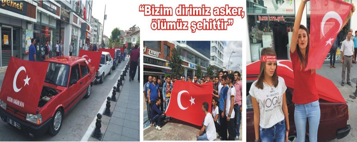 Karaçayır Mahallesi'nde toplanan 100 araçlık konvoy, polis ekiplerinin kontrolünde İzzet Baysal Caddesi ve kentin işlek caddelerinde kornalarını çalarak terör örgütü PKK aleyhinde sloganlar attı. Otomobillerinin üzerinde, “Bizim dirimiz asker, ölümüz şehittir” ve “Vatan sağolsun” yazıları dikkat çekti. Grup üyeleri, İzzet Baysal Caddesi'nde durarak İstiklal Marşı okudular. Vatandaşların da destek verdiği grup, kornolarını çalarak tepkilerini gösterdikleri protestolarını olaysız bir şekilde sonlandırdılar.