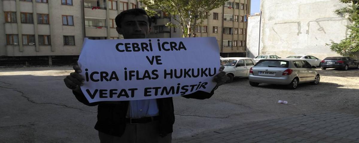 Hukuki mücadeleden bir sonuç alamayan Harun Balta, çözümü protesto da buldu. Hak kazandığı parayı alamayan Balta, Adliye önünde “Cebri İcra ve İcra İflas Hukuku vefat etmiştir” yazılı pankart açtı.