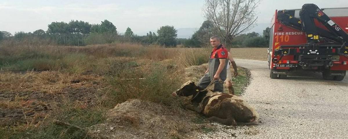 Büyükberk Köyü'nde sahibinin otlamak için meraya bıraktığı inek çamura saplandı. Hayvanın çamurda çırpındığını gören köylüler itfaiyeyi arayarak yardım istedi. Olay yerine gelen Bolu Belediyesi İtfaiye Müdürlüğü'ne bağlı ekipler, ineğin beline halat bağladı. Daha sonra vinçle ineği bataklıktan kurtaran ekipler, sahibine teslim etti.