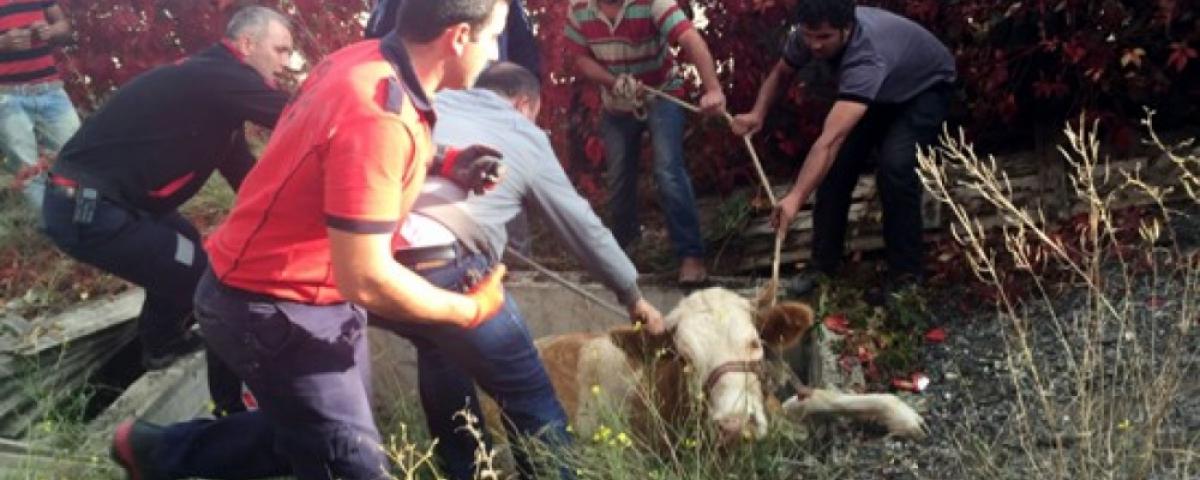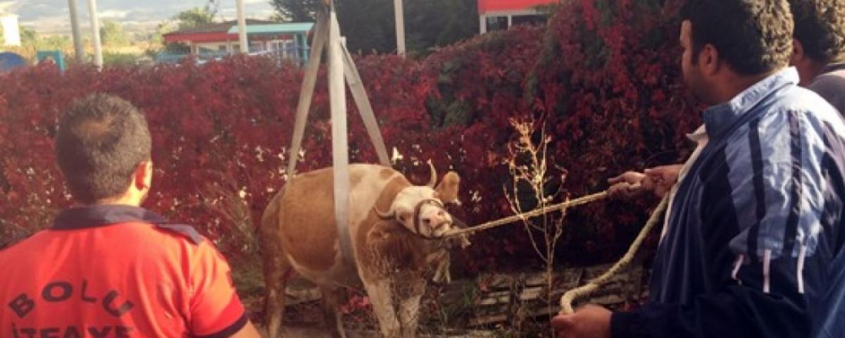 Edinilen bilgiye göre, Çıkınlar Mahallesi D-100 karayolunun hemen kenarında çayırlık alanda otlayan Sadettin Babat’a ait inek, akaryakıt istasyonunun içinde bulunan su kanalına düştü. İnek vatandaşlar tarafından çıkartılamayınca Bolu Belediyesi İtfaiye Müdürlüğü’ne bağlı kurtarma ekiplerine haber verildi. İtfaiye ekipleri huysuzlaşarak saldırganlaşan ineğe halat bağladılar. İtfaiye aracının vinci ile su kanalından çıkartılan inek etrafa saldırmaya başladı. Vatandaşlar korkuyla sağa sola kaçışırken, itfaiye ekipleri ineği sakinleştirmeyi başardı. Sahibinin bir yakını tarafından götürülen inek otlaması için çayıra salıverildi.