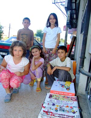 Okulların yaz tatiline girmesini fırsat bilen Emre Özer (10), Batuhan Akça (10), Zeynep Gül (9), Ayşe Güçlü (9) ve Tuğçe Varol(11), kendi elleriyle yaptıkları takıları okul harçlığı çıkarmak için satıyor. Sabahtan öğleye kadar yaz Kur'an kursuna gittiklerini ve öğleden sonra akşama kadar boncuklardan takı yaparak sattıklarını söyleyen çocuklar, 2008-2009 eğitim-öğretim yılı öncesinde okul harçlığı biriktirdiklerini söyledi. Boş durmaktan hoşlanmadıklarını ve okul harçlığını çıkarabilmek için çalışmak