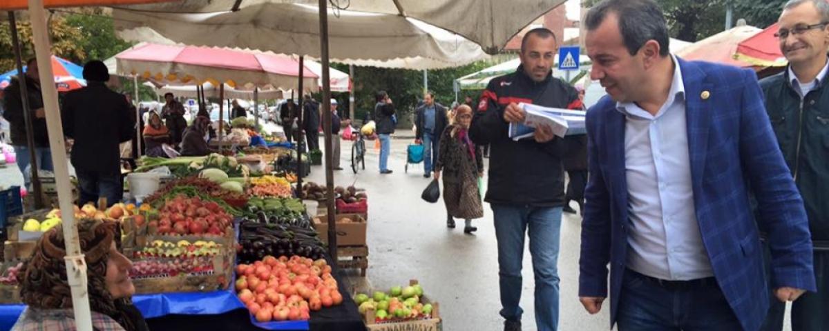 Tanju Özcan, Gerede'de ki Çalışmalarının Ardından Milletvekili Adayı Elfaz Temiz, Kadın Kolları Başkanı İlçe, Gençlik Kolları Başkanı Mert Karagöz ve Gençlerimiz İle Birlikte Merkez İlçe Bahçelievler Semt Pazarında pazarcı esnafıyla bir araya gelerek sohbet etti. Destek isteğini yeniledi.Haber Merkezi