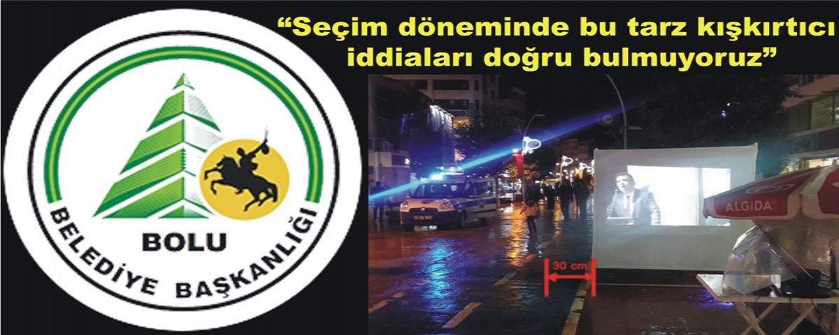 “Bolu Belediyesi zabıta ekibi kendilerine gelen bir şikâyeti değerlendirmiştir. Zabıta ekibimiz tarafından ‘yaya trafiğinin engellenmemesi, vatandaşların her hangi bir olumsuzlukla karşılaşmaması’ için seçim stantlarının bulunduğu yerle ilgili uyarıda bulunulmuştur. Şehrimizin yaya trafiği açısından en işlek caddesi olan izzet Baysal Caddesi bisiklet yolu üzerinde yer alan standın ‘vatandaşın geçişini engellemeyecek noktaya taşınma uyarısı’ dışında, zabıtalarımız tarafından her hangi bir işlem ya da müdahale olmamıştır.
