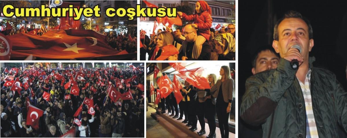 CHP Bolu İl Başkanlığı'nca 29 Ekim Cumhuriyet Bayramı nedeniyle fener alayı düzenlendi. Belediye Meydanı'nda toplananlar Türk bayrakları ve fenerlerle İzzet Baysal Caddesi'nde yürüdüler. Aralarında CHP Bolu Milletvekili Tanju Özcan'ın da bulunduğu yaklaşık 3 bin kişi 10'uncu Yıl Marşı eşliğinde yürürken, bazı esnaflar da ellerinde Türk bayrakları sallayarak destek verdiler. Kent Meydanı'nda son bulan yürüyüşte meydanı dolduran kalabalığa seslenen CHP Bolu Milletvekili Tanju Özcan, Cumhurbaşkanı Recep Tayyip Erdoğan'a tepki göstererek, "Birileri birkaç ay önce "Milliyetçiliği ayaklarımın altına alırım diyordu. Şimdi en büyük Türk milliyetçisi kesildi. Bunlar konjektürel milliyetçi, konjektürel Atatürkçü, bunlar çakma milliyetçi. Bunların ne olduğunu kim olduğunu hepimiz öğrendik. Bunlar o kadar zavallı insanlar ki, o kadar nankör insanlar ki cumhuriyetin faziletlerini bile anlayamamışlar. Ben buradan sesleniyorum. Cumhuriyet sayesinde biz bu günlere geldik. Bu ülkenin cumhurbaşkanı senin baban Rize'de bir kayıkçıydı. Eğer Rize'deki kayıkçının oğlu bu ülkede Cumhurbaşkanı olabiliyorsa senin bu cumhuriyetin değerlerini öpüp başının üstüne koyman lazım. Nankörlük etmeyi bir kenara bırak" dedi.Haber Merkezi