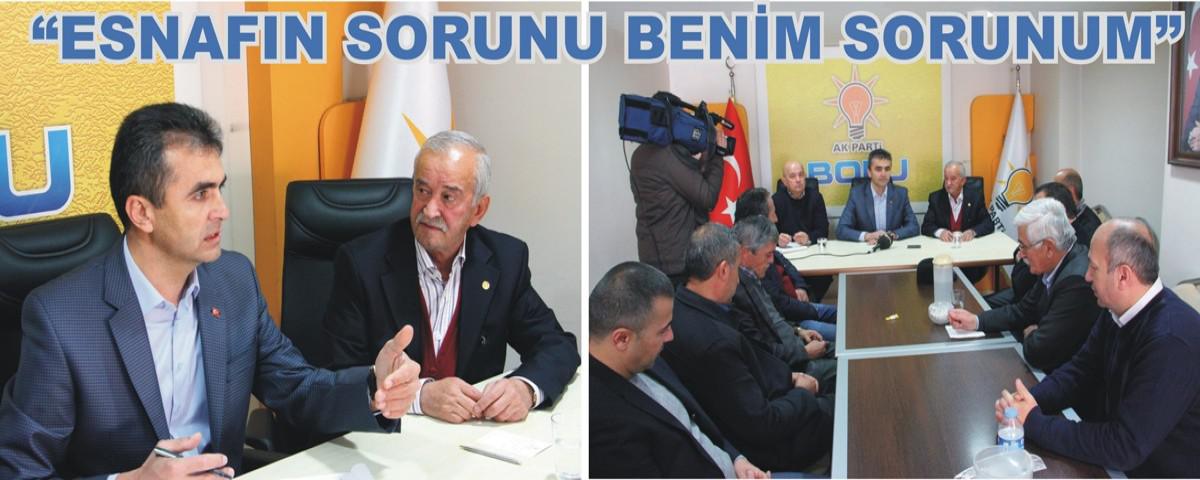 İktidar partisi il başkanı ile şoförler odası temsilcilerini bir araya getiren ziyarette, şoför esnafının talep ve sorunları da masaya yatırıldı. Bolu Şoförler ve Otomobilciler Odası Başkanı Nihat Alpat Öztürk, Hükümetin 65 yaş üstü vatandaşlara ücretsiz ulaşım hakkı tanımasının esnafı olumsuz etkilediğini ifade ederek, Bolu Belediye’nin meclis kararı ile bilet fiyatlarında iyileştirmeye gitmesinin kendilerini sevindirdiğini ifade etti. Servis (S) Plaka konusuna da değinen Bolu Şoförler ve Otomobilciler Odası Başkanı Nihat Alpat Öztürk, daha önceki ihale fiyatının yüksek olduğunu belirterek, Aralık ayı içerisinde 2’nci defa ihaleye çıkacak olan 15 adet S plakanın esnafın hassasiyetleri göz önünde bulundurarak fiyatlandırmasını talep etti. Ziyarette son olarak ticari taksilerin sorunlarına değinen Öztürk, her gün çok sayıda yerli ve yabancı turistin ziyaret ettiği Abant Tabiat Parkı’na müşteri götüren ticari taksilerden ücret alındığını belirterek “Ticari taksilerimizin Abant’a girişlerinde Milli Parklar Müdürlüğü tarafından ücret talep ediliyor. Ticari taksiciler olarak bizler Bolu turizmine katkı sağlamak istiyoruz. Giriyor yolcumuzu bırakıp geri dönüyoruz. Burada bir mağduriyet var” diyerek taksici esnafı adına Doğanay’dan destek istedi.