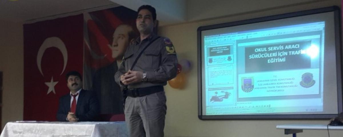 Jandarma onbaşı Kor Özbay, hız limitleri hakkında bilgi vererek her bir aracın özelliklerine göre hız limitlerinin farklı olduğundan bahsederek hız limitlerine uymalarını istedi. Kış mevsimi girdiği için kış lastiği takma zorunluluğundan bahsederek uyarılara uymadıkları takdirde cezai işlem yapmak durumunda kalabilecekleri uyarısı yaptı. Kemer takmanın hayati önem taşıdığından bahseden Özbay, okul servislerin özelliklerinden, serviste bulunması gereken acil yardım malzemelerinden bahsetti. Trafik Polisi Kadir Özkan ise, internetten derlediği kazalara ait videolar izleterek, kazaların görünmez olduğuna vurgu yaptı. Kaza geliyorum demez, kaza anlık meseledir diye sürücüleri uyardı. Sürücülere trafikle ilgili broşür, kitapçık ve sürücü belgesi ile evraklarını koymaya yarayan cüzdanlar dağıtıldı. Seminere katılan sürücülerin eğitimden memnun ayrıldıkları gözlendi.haber Merkezi