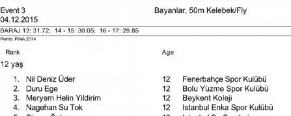 Bolu Yüzme Kulübü, Fenerbahçe, G.Saray, Enka gibi spor kulüplerinin arasından sıyrılarak büyük bir başarıya imza attı. İstanbul Burhan Felek Yüzme Havuzu’nda yapılan müsabakalar sonucunda Bolu Yüzme Kulübü’nden Duru Ege 50 metre Kelebek ve 100 metre Kelebek kategorilerinde Türkiye 2.si oldu. Duru Ege tüm zorluklara rağmen, bu başarıyı göstermiş bir yüzücü!! Bolu Express Spor Servisi olarak sporcumuzu ayakta alkışlıyor, yolunun açık başarılarının daim olmasını diliyoruz.