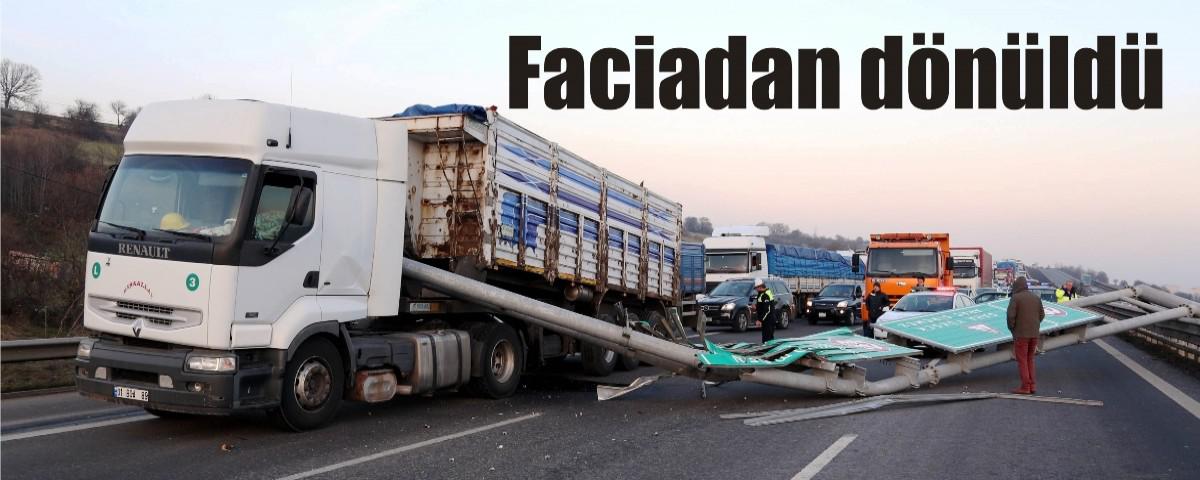 Çarpmanın etkisiyle devrilen ve bir kısmı tır ile dorsenin arasında kalan levha, otoyolun İstanbul yönünü ulaşıma kapattı.