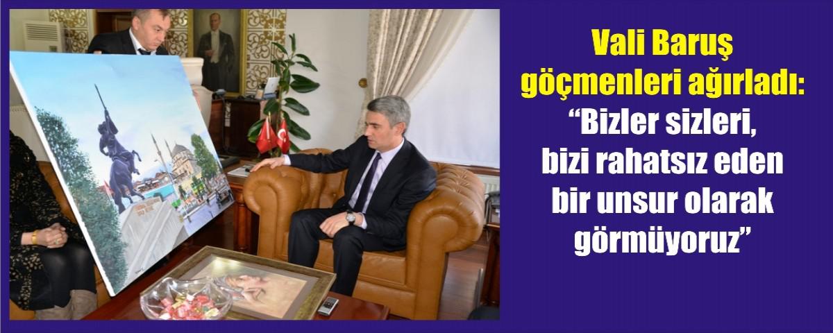Ziyaret dolayısıyla bir araya gelen yabancı uyruklu misafirlerini ağırlamaktan duyduğu memnuniyeti dile getirerek, ülkemizde bulunan tüm göçmenlerin Göçmenler Günü'nü kutlayan Bolu Valisi Aydın Baruş, millet olarak yüzyıllardan beri insana değer veren bir anlayışı takip ettiklerini dile getirerek, "Tüm kardeşlerimizin Göçmenler Günü'nü kutluyorum. Ülkemizde Göçmenler Günü üç yıldan beri kutlanıyor. Türkiye'de yaşayan göçmenlerin sorunlarını daha iyi anlamak için İçişleri Bakanlığımız tarafından böyle bir gün organize ediliyor. Bizler Bolu'da 6 bin civarında göçmen kardeşimizle birlikte yaşıyoruz. Türkiye dünyada zorda olan ve kendini güvende hissetmeyen, sıkıntıdaki insanlara kucak açan bir ülke. Bizler millet olarak yüzyıllar boyunca böyle bir anlayışı takip ettik. Umarım ki Türkiye'de güven içinde yaşamaktan mutlusunuzdur. Bizler sizleri, bizi rahatsız eden bir unsur olarak görmüyoruz, bilakis emin bir sığınak olmaktan memnuniyet duyuyoruz" ifadelerinde bulundu.