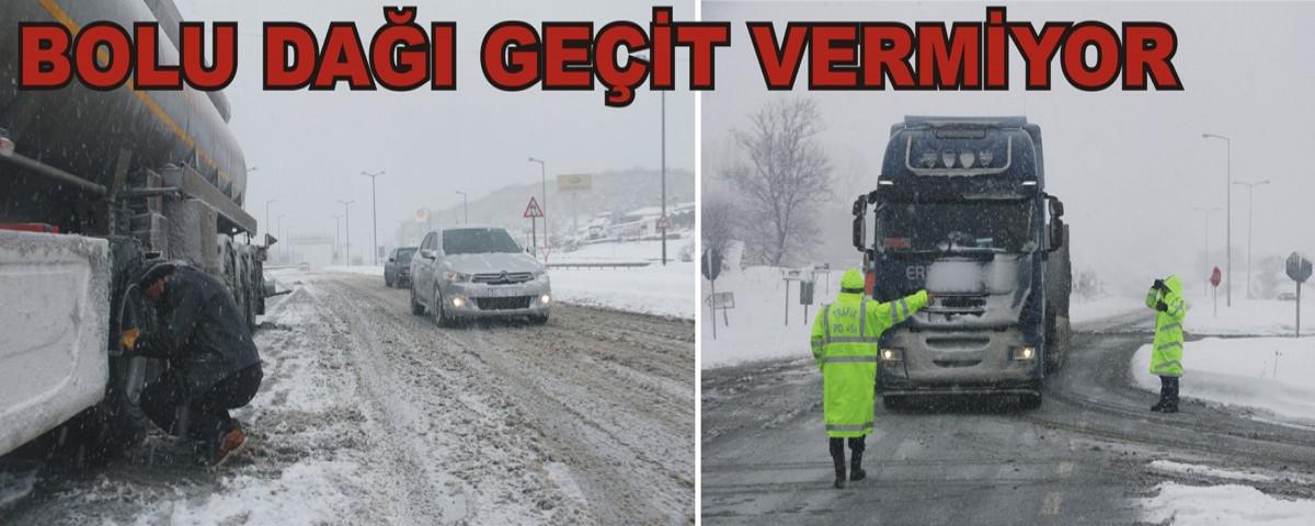 Gece saatlerinden itibaren etkili olan kar yağışı Bolu Dağı'nda hayatı felç etti. Yoğun şekilde süren kar yağışının etkisini iyice artırmasıyla ağır tonajlı araçlar D-100 Karayolu'na yönlendirildi. Ancak burada da zeminde etkili olan kar yağışı nedeniyle, Elmalık mevkisinde polis ekipleri harekete geçti. Ağır tonajlı araçların D-100 Karayolu'ndan İstanbul istikametine gidişlerine izin verilmiyor. Normal araçlar ise zincir takarak yollarına devam ediyor. İHA