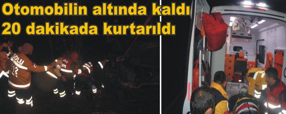 Edinilen bilgiye göre, kaza saat 22:30’da Abant Tabiat Parkı yolu Ömer Köyü mevkiinde meydana geldi. Abant’tan Bolu istikametine giden Güray Uzun yönetimindeki 14 LE 329 plakalı otomobil, yağmur yağışı nedeniyle sürücüsünün direksiyon hakimiyetini kaybetmesiyle dere yatağına uçtu. Otomobilin altında kalan sürücü ‘Kurtarın beni’ diye bağırırken, olay yerine gelen Bolu Belediyesi İtfaiye Müdürlüğü Arama Kurtarma ve 112 acil ekipleri tarafından 20 dakika süren çalışma sonrasında kurtarıldı. Köroğlu Devlet Hastanesi’nde tedavi altına alınan sürücü Güray Uzun’un sağlık durumunun ciddiyetini iyiye gittiği ifade edildi. Jandarma ekipleri kazayla ilgili inceleme başlattı.İHA