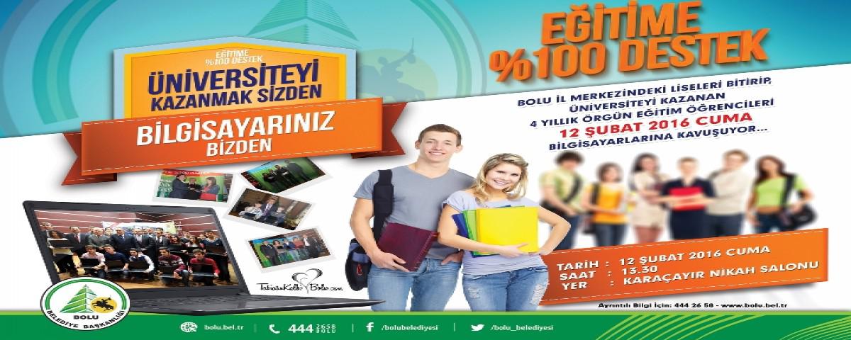 Bolu Belediyesi ‘Eğitime %100 Destek’ projesi kapsamında belirlenen şartları taşıyan öğrencilere laptop hediye edecek. Bu yılda geleneği bozmayan Bolu Belediyesi 4 yıl ve üzeri örgün eğitim yapan üniversitelerden birine kayıt yaptırmış, Bolu Merkez İlçedeki lise ve dengi okullardan mezun olan bütün öğrencilere laptoplarının dağıtımı 12 Şubat Cuma günü Saat 13.30’da Karaçayır’da düzenlenecek törenle ile yapılacak.