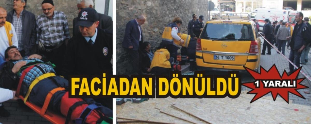 Edinilen bilgiye göre, olay Aktaş Mahallesi Parti Sokak’ta meydana geldi. 3 katlı apartmanın çatı katında yapılan onarım çalışmaları sırasında çatıdan aşağıya 7 adet sunta parçası düştü. O sırada yoldan geçen ve elektrik parasını yatırmaya giden Fahrettin Özer isimli vatandaş suntaların üzerine düşmesi sonrasında yaralanırken, Umut Keskin yönetimindeki 14 T 1005 plakalı ticari taksinin arka camı kırıldı.
