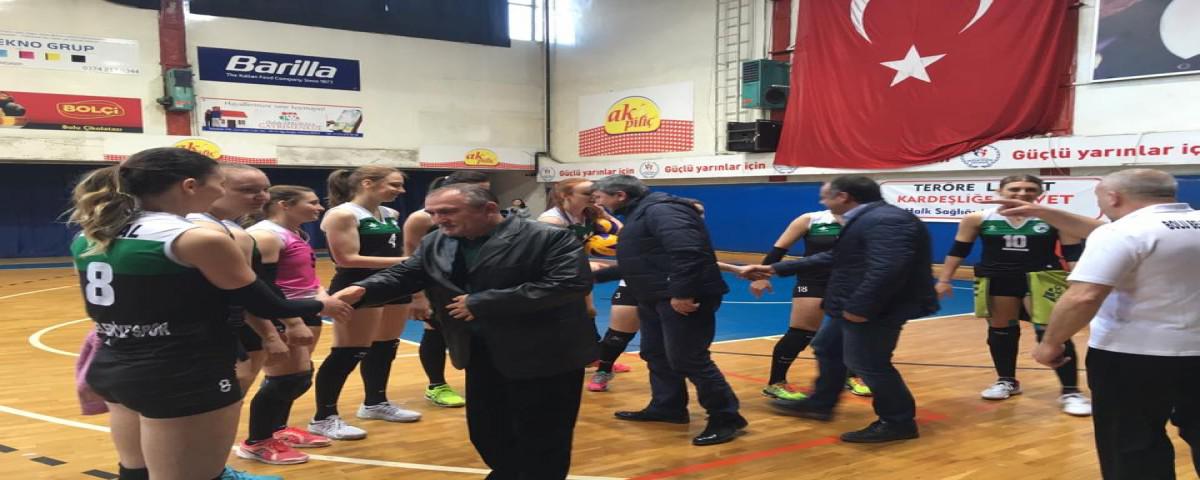 Play-off potasından kopmak istemeyen temsilcimiz haftasonunda kendi sahasında Gümüşhane Bld. G.hane Gb bayan voleybol takımını konuk ederken tek hedef galibiyet olarak belirlenmişti. Sezona birinci lig parolası ile başlayan Sultanlar bu hedef doğrultusunda ilerlemeye devam ediyor. Normal sezonun bitimine son iki hafta kala play-off potasındaki yerini koruyan Bolu Belediyespor bayan voleybol takımı ligin 25.haftasında kendi sahasında Gümüşhane Bld. G.hane Gb bayan voleybol takımını konuk etti. Ligin ikinci yarısına damga vuran Sultanlar ilk yarının son iki maçı ile birlikte toplam 12 maçlık bir yenilmezlik serisi yakalamış ancak geçen hafta Numune’ye yenilince heyecan son 2 haftaya kalmıştı. Rakiplerinden fikstür olarak son 2 haftaya daha rahat giren Sultanlar oldukça rahat oynadığı maçın ilk setini 25-17 alarak maçta 1-0 öne geçti. 2.sette temsilcimiz biraz rehavete kapılsa da rakibine fırsat vermedi ve 25-20 ile maçta durumu 2-0’a getirdi. Bu setle birlikte rakip takımı iyice oyundan düştü. 3.seti çok rahat bir şekilde 25-12 alan Bolu Belediyespor Bayan Voleybol Takımı maçtan 3-0 galip ayrıldı. Play-Off yolundaki rakipleri Samsun 19 Mayıs ve Numune takımının son haftada karşı karşıya gelecek olması nedeniyle temsilcimiz son hafta öncesi Bursa’da yapılacak olan Süper Lige Yükselme Play-Off maçlarına katılmaya hak kazandı. Maç sonrasında Bolu Belediyespor ekibinin sevincine temsilcimizi kutlayan Bolu Belediye Başkanı Alaaddin Yılmaz da katıldı. Sultanlarımız son haftada formalite maçında Sakarya Hendekspor ile deplasmanda karşılacak.