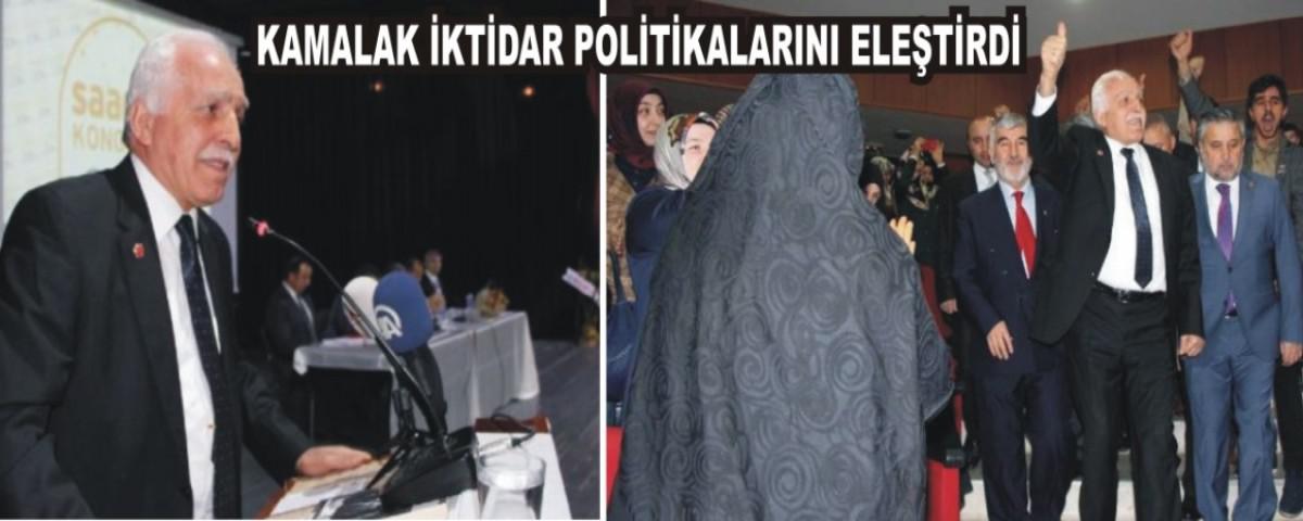 Bolu Müze ve Kültür Müdürlüğü'nde düzenlenen partisinin Bolu İl Kongresi'nde konuşan Saadet Partisi Genel Başkanı Mustafa Kamalak, hükümeti eleştirdi. Terör olaylarının 2002 yılında bitme noktasına geldiğini ifade eden Kamalak, şöyle dedi: "Bugün Türkiye'miz terörle mücadele ediyor. Aslında 10 yıl önce terör aşağı yukarı sıfırlanmıştı. Ne yazık ki son 4-5 yıl içerisinde ehliyetsiz eller yüzünden, ehliyetsiz yöneticiler yüzünden, devlet tecrübesine sahip olmayan kadrolar yüzünden terör adeta kuluçkaya yatırıldı. 2002 seçimlerinde TBMM'nin yüzde 85’i yenilendi. Yüzde 35 oy alan Ak Parti iktidara geldi. Bunların en tecrübelisi Belediye Başkanıydı. Erbakan hocamız boşuna demiyordu; ‘Devlet yönetimi çoluk çocuk işi değildir.' Bunlar iktidara geldiğinde mi terör bu kadar azgındı? Şimdi mi daha azgın? Tabii ki şimdi daha azgın. Sonra diyorlar ki 'Terörle mücadele ediyorlar.' Terörü kuluçkaya yatırıp bu kadar azdıran bunlar değil miydi? Ben bunları söyleyince, ‘CHP’li gibi konuşuyor’ diyorlar. CHP benim gibi konuşamıyor bile. Ben meclistekilerin hepsinin hocası durumundayım. Onlardan kopya çekecek halim yok benim." Yeni Anayasa görüşmelerine de değinen Kamalak, "Dedik ki, ‘Siz bu yapınızla mı Anayasa değiştireceksiniz? Bu ekip anayasa yapmak bir yana bir masaya oturup çorba bile içemezler.' Aynen dediğim gibi de oldu" dedi.