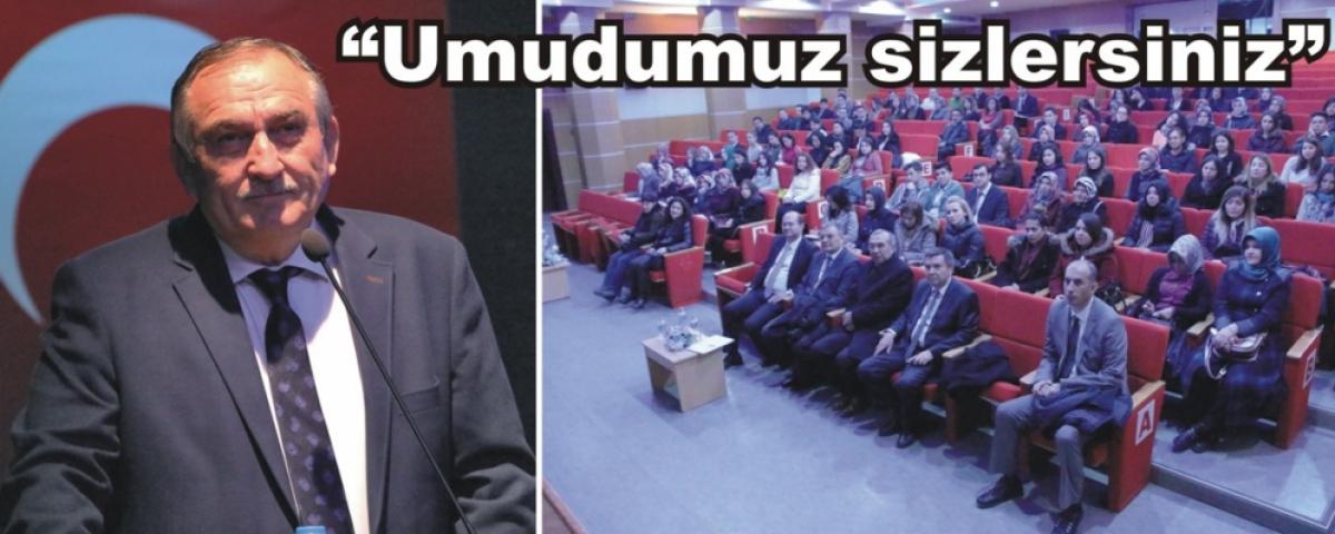 Belediye Başkanı Alaaddin Yılmaz, eğitim hayatında yaşadığı sıkıntılardan kesitler vererek öğretmen adaylarına kendisine güvenen bireyler yetiştirmelerini istedi. Aday öğretmenlere, “ Sizlerden tek istediğim önce kendinize güvenin” diyen Başkan Yılmaz konuşmasına şöyle devam etti; “Yetiştireceğiniz insanlara vereceğiniz tek şey de kendilerine güvenmelerini sağlamanız. Bu çok önemli. Eğer o güveni sağlayamasanız ayakta duramaz hayata umutsuz bakar. Belediye Başkanı olduğumda çok sıkıntılı bir döneme girdik. Ama hiçbir zaman bahane üretmeye çalışmadık. Yoğun bir çalışma içine girdik. Adım adım hedefe gitmenin heyecanını yaşadık. Şuan bolu geleceğe umutla bakan bir şehir halinde dönüştü. Şuanda Bolu Belediyesi kendi nüfusuna göre Türkiye’de en güçlü Belediye haline dönüştü. Örnek verecek olursak Türkiye’de Bolu Dağı tüneli 20 yılı aşkın bir sürede yapıldı. Bir sürü hükümet değişti. Şu an Bolu Belediyesi olarak 3.5 km tünel ihalesini yaptık. Bolu’ya içme suyu getirmek için. Çok yakında da ilk kazma vurulacak. Türkiye’de yıllarda yapılamayan bir yolu şuanda Bolu Belediyesi kendi başına problemsiz yapacak hale geldi. Bunlar adım adım ilerleyen kendine güvenerek ve ekip çalışmasıyla geleceğe güvenle bakacak çalışmalardır. İnsanlar kendisini çok iyi kavrar ve Allah’ın verdiği güç ve birikimi çevreye yansıtırsa yapamayacağı hiçbir şey olmadığını söyleyebilirim. Yeter ki kendine güvensin ve inansın. Böyle nesiller yetiştirecek olanlarda sizlersiniz. Umudumuz sizlersiniz.”