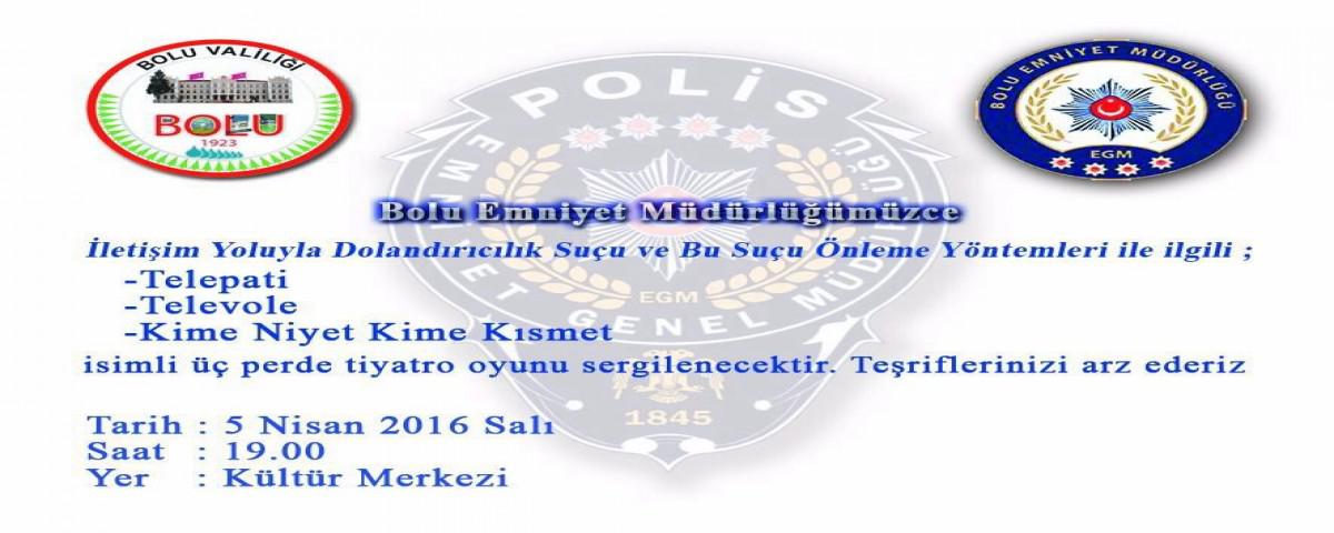 Bolu Emniyet Müdürlüğü; iletişim yoluyla dolandırıcılık suçu ve suçu önleme yöntemleriyle ilgili bir tiyatro gösterisi hazırladı. Bolu Emniyetine bağlı polislerin rol alacağı tiyatro oyunu “Telepati, Televole ve Kime niyet kime Kısmet” isimleriyle, üç perde halinde sergilenecek.