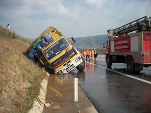 Edinilen bilgilere göre, Ankara'dan İstanbul istikametine gitmekte olan Tevfik G. idaresinde 55 EU 095 plakalı tuğla yüklü kamyon, Bolu Dağı tünel çıkışında balatalarının ısınması sonucunda alev aldı. Tünel itfaiyesinin müdahalesiyle söndürülen kamyonun şoförü, tüm uyarılara rağmen tekrar yola çıktı. Bu kez Kaynaşlı mevkiinde yanmaya başlayan kamyon, lastiklerinin patlamasıyla yoldan çıkarak yan yattı. İtfaiyenin zamanında müdahalesi ile söndürülen kamyonda ufak çarpa maddi hasar meydana geldi.