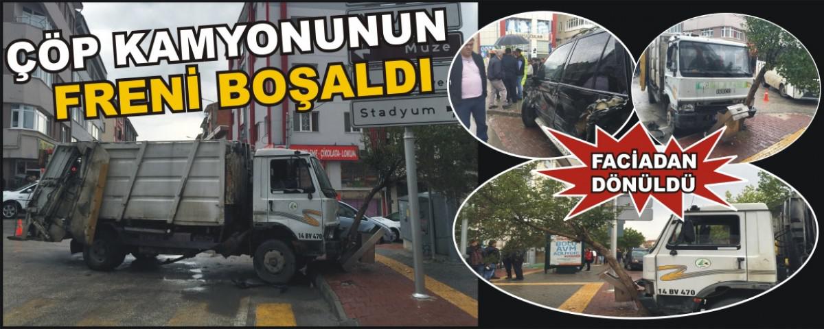 Edinilen bilgiye göre, kaza saat 15.15’te İsmetpaşa Caddesi’nde meydana geldi. Erhan Turgut yönetimindeki 14 BV 470 plakalı çöp kamyonu, freni boşalması sonrasında ilk önce 14 FB 827 plakalı minibüse, ardından 14 DN 005 plakalı cipe çarptı. Sürücü Erhan Turgut sol tarafı yokuş sağ tarafında ise otobüs durağı olan caddede kamyonu ağaca çarparak durdurabildi. Kazada şans eseri yaralanan olmazken, vatandaşlar büyük korku yaşadı. İsmetpaşa Caddesi 1 saat boyunca ulaşıma kapalı kaldı. Polis ekipleri kazayla ilgili inceleme başlattı.İHA