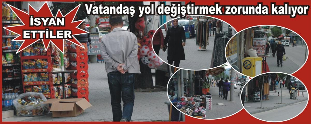İsmetpaşa caddesinde de aynı sorun yıllardır var. Ancak ne hikmetse yetkililer buraları hiç görmüyor. Yayaların çok daha yoğun olduğu İsmetpaşada kaldırımların yarısından fazlası işgal edilmiş durumda. İki kişi karşılaşsa biri diğerine yol vermek zorunda.