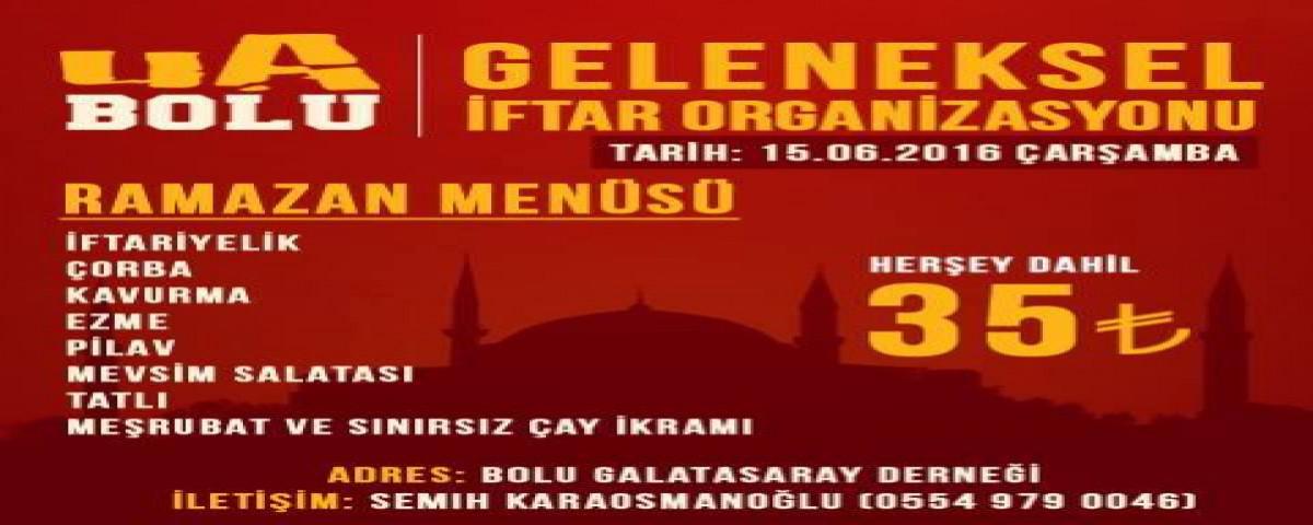 Sarı-kırmızılı taraftarların bir araya geleceği iftar yemeği önümüzdeki hafta gerçekleşecek. Konuyla ilgili olarak gruptan yapılan açıklama şöyle: “ultrAslanBolu olarak her yıl Ramazan ayında düzenlediğimiz iftar organizasyonumuz bu yıl 15.06.2016 Çarşamba Günü olacaktır. Adres: Bolu Galatasaraylılar Derneği. Gelmek isteyen arkadaşlarımız bizimle irtibata geçsinler lütfen. Bu yıl düzenlediğimiz iftar yemeğinde kardeşlerimizle yine bir araya geleceğiz. Biz Bir Aileyiz Kenetlendikçe Daha Da Büyüyen.” İftar yemeğinin adresi Bolu G.Saray Taraftarları Derneği olacak.