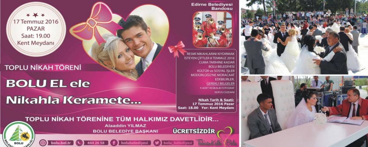 “Atatürk’ün Bolu’ya gelişinin 82’inci yıl dönümü” kutlama etkinlikleri kapsamında 17 Temmuz 2016 günü saat 18.30’da Kent Meydanı’nda “toplu nikâh töreni” düzenlenecek. “Bolu el ele, nikâhla keramete” sloganı bu yıl 5'incisi düzenlenecek “toplu nikâh töreni” için başvurular başladı. Nikâh için her hangi bir ücret alınmayacak olup, çiftlerin “4 adet vesikalık fotoğraf” ve “nüfus cüzdanları” ile bizzat başvuruda bulunmaları yeterli olacak. Bolu Belediyesi’nin düzenleyeceği nikâh töreninde hayatlarını birleştirmek isteyen çiftler en geç 8 Temmuz 2016 tarihine kadar Bolu Belediyesi Kültür ve Sosyal İşler Müdürlüğü’ne gelerek bizzat başvuruda bulunabilecek.