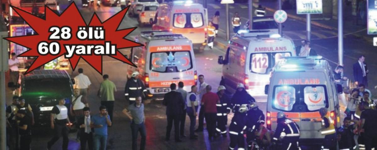 İstanbul Atatürk Havalimanı'nda 3 canlı bomba patladı. İstanbul Valisi Vasip Şahin'in açıklamasına göre hain saldırıda 28 kişi hayatını kaybetti... Vali Şahin şunları söyledi: "Değerli basın mensupları, bugün Atatürk Havalimanı Dış Hatlar Terminali geliş katı yolcu karşılama salonu girişinde sayısını 3 olarak değerlendirdiğimiz canlı bomba intihar saldırısında, ilk belirlemelere göre 28 kişi hayatını kaybetti. 60'a yakın yaralı hastanelerimize intikal ettirilmiştir. Yaralıların tedavileri, hastanelerde devam etmektedir. Detaylı incelemeler her yönüyle sürdürülmekte olup, gelişmelerden kamuoyu ayrıca bilgilendirilecektir. Yine yolcu giriş ve çıkışları hızla normale dönüştürülmekte olup kısa zamanda planlı uçuşlara başlanacaktır."