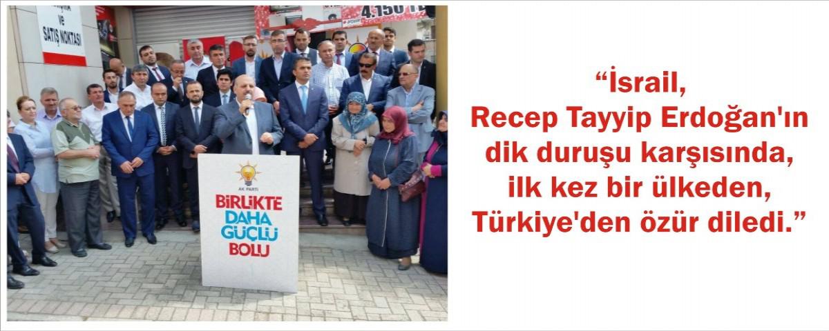 Yaklaşık 2 yıl önce İsrail Başbakanının Cumhurbaşkanımız Recep Tayyip Erdoğan'dan özür dilediğine hepimiz bizzat şahit olduk. Geçtiğimiz süreçte de tazminat konusunda ve Gazze'ye yönelik ablukanın kısmen de olsa kaldırılması noktasında anlaşmaya varıldı. Bu anlaşmayı önümüzdeki süreç için önemli bir adım olarak görebiliriz. Hepimiz biliyoruz ki, Cumhurbaşkanımız Recep Tayyip Erdoğan'ın hiçbir vatandaşımızın başını öne eğecek anlaşmaya imza atması mümkün değil. İsrail devleti kurulduğunda ilk tanıyan devlet Türkiye olmuştu. O dönemde Cumhurbaşkanı İsmet İnönü idi. Kurulduğu günden bu yana, elinde birçok masum insanın kanı olan, başta masum Filistin olmak üzere dünyanın birçok ülkesine karşı hukuksuz eylemlere imza atan İsrail'in, Amerika dahil olmak üzere, hiçbir ülkeden özür dilediğine şahit olmamıştık. Bugün İsrail, Cumhurbaşkanımızın dik duruşu karşısında, ilk defa bir ülkeden özür diledi. Türkiye'den ve Cumhurbaşkanımız Sayın Recep Tayyip Erdoğan'dan özür diledi."