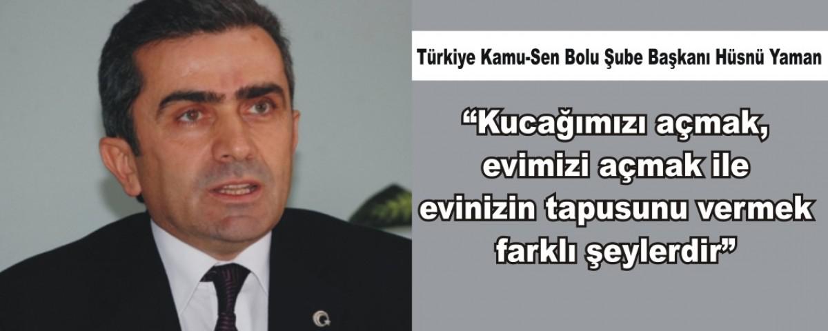 Türkiye'de bulunan 3 buçuk milyon Suriyeliye Türk vatandaşlığı hakkı verilmesine yönelik açıklamaları değerlendiren Türkiye Kamu-Sen Bolu Şube Başkanı Hüsnü Yaman, "Bu karar halka sorulmalı ve sonrasında hayata geçirilmelidir. Bu kararın sonuçları halkımızı ekonomik ve sosyal yönden fazlasıyla etkileyecektir" dedi. Biz millet olarak misafirperverizdir. Mazluma her zaman kucak açmış ve sahip çıkmışızdır. Bunu onca ekonomik sıkıntılara rağmen misafirperverliğimizden asla taviz vermeyerek de gösterdik. Kucağımızı açmak, evimizi açmak ile evinizin tapusunu vermek farklı şeylerdir. Kamuda istihdam edilmeleri ise büyük sıkıntılara ve sosyal problemlere neden olacaktır. Siyasi iktidarın bu konudaki yanlışlarının bedeli halka ödetilmemelidir” dedi.