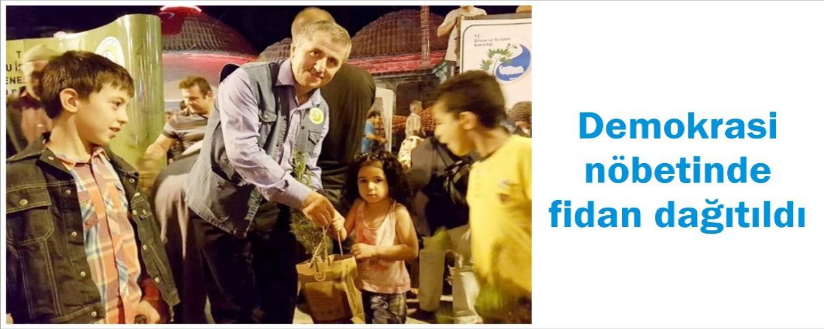 16 Temmuz akşamından itibaren hiç aksatmadan Bolu Belediye Başkanlığı önünde Demokrasi Nöbet tutan vatandaşlarımıza, 15 Temmuz 2016 tarihinde yaşanan menfur kalkışma sonucu Şehit olan Demokrasi Şehitlerimizin ilelebet hatırlanması için bin adet fidan dağıtıldı. Fidan dağıtımına vatandaşlar yoğun ilgi gösterdi ve dağıtılan fidanlar kısa sürede tükendi. Vatandaşlara Bolu Orman Bölge Müdürlüğü tarafından fidan dikimi konusunda teknik bilgi verildi. Fidan alan vatandaşların memnuniyeti gözlerinden okunuyordu.