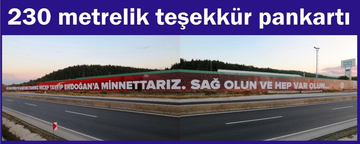 Biz Bolu Belediyesi olarak yaptırdığımız bu dev pankartla milletimize ve Cumhurbaşkanımıza şükranlarımızı, teşekkürlerimizi ve bu yoldaki kararlığımızı yansıtmak istedik. Bu arazinin sahibi ve dev pankartın asılmasına izin veren değerli Burhan Çelik’e de yürekten teşekkür ediyoruz.
