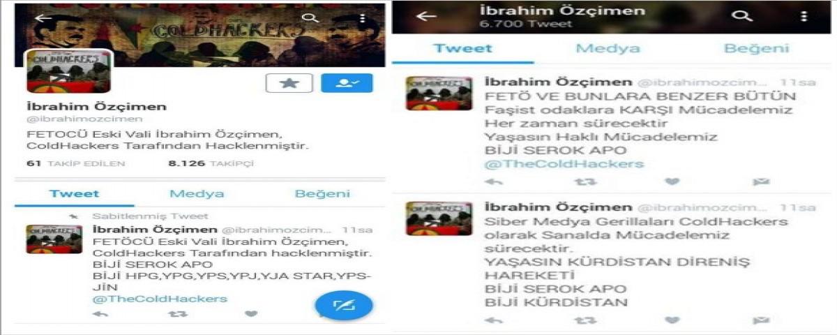Fethullahçı Terör Örgütü soruşturması kapsamında tutuklanan Bolu eski Valisi İbrahim Özçimen’in aktif şekilde kullandığı Twitter adresi PKK sempatizanları tarafından hacklenerek “Biji Serok Apo” paylaşımlarıyla dolduruldu. Eski valinin twitter hesabı bilgisayar korsanlarının eline geçtikten sonra “FETO’cu Eski Vali İbrahim Özçimen ColdHackers tarafından hacklenmiştir” notu düşülürken, hesapta aynı zamanda PKK terör örgütü elebaşı APO’nun reklamı yapıldı.