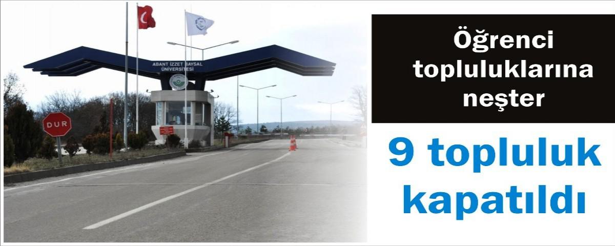 AİBÜ Rektörlüğü tarafından Altın Nesil Topluluğu (FETÖ), Etik Değerler Topluluğu, Serbest Düşünce Topluluğu, Kitap Topluluğu, Sosyal Medya Araştırmaları Topluluğu, Sinema ve Düşün Topluluğu, Kültür Edebiyat Sanat ve İletişim Topluluğu, Toplumsal Cinsiyet Topluluğu ve Kolektif Basın ve Felsefe Atölyeleri Topluluğu’nun faaliyetlerine son verildiği ifade edildi. Topluluklardan ikisinin FETÖ, diğerlerinin illegal olduğu gerekçesiyle kapatıldığı belirtiliyor.