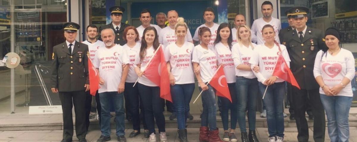 29 Ekim coşkusuna esnaflar da katıldı. Turkcell Öztürkler çalışanları “Ne mutlu Türküm diyene” yazılı tişört ve ellerinde bayraklarla etkinliklere destek verdiler. 29 Ekim Cumhuriyet Bayramı'nda Bolu esnafları da büyük coşku yaşadı. Turkcell Öztürkler çalışanları da ellerinde bayraklarla bayram coşkusuna coşku kattılar. Ne Mutlu Türküm yazan tişörtleri ve Türk bayraklarıyla Zafer Bayramını kutlayan çalışanlar, çocuklara balon ve bayrak hediye ettiler.