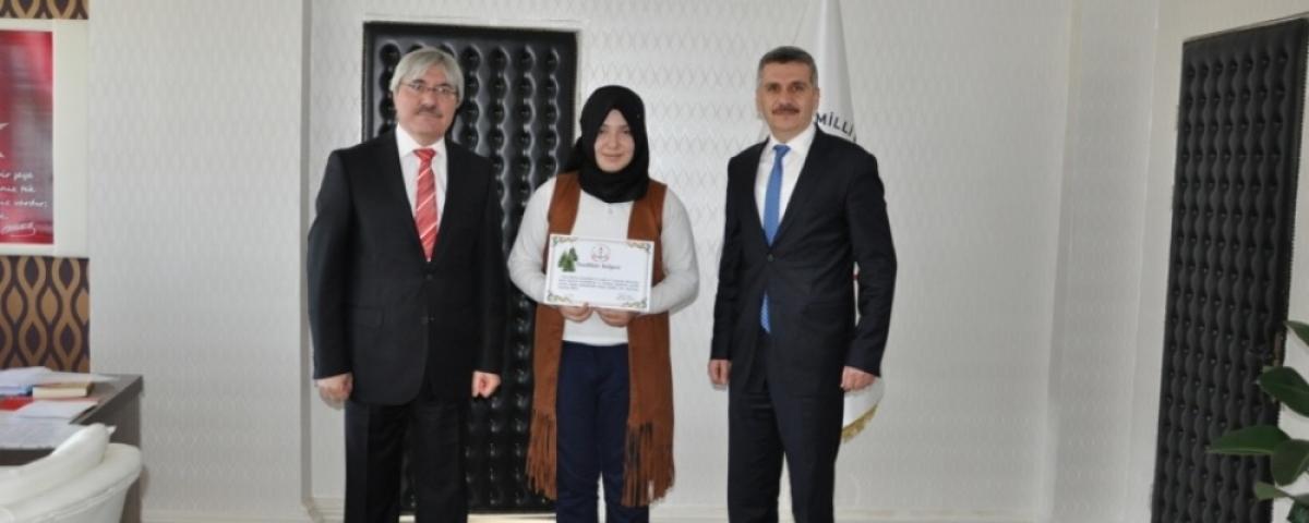Milli Eğitim Müdürü Yusuf Cengiz 15 Temmuz olayları ile ilgili bir yazı kaleme alan Sakarya Ortaokulu 8.sınıf öğrencisi Rana Meryem Öztürk’ü ve Sakarya Ortaokulu Müdürü İsmail Şener’i makamında ağırladı.