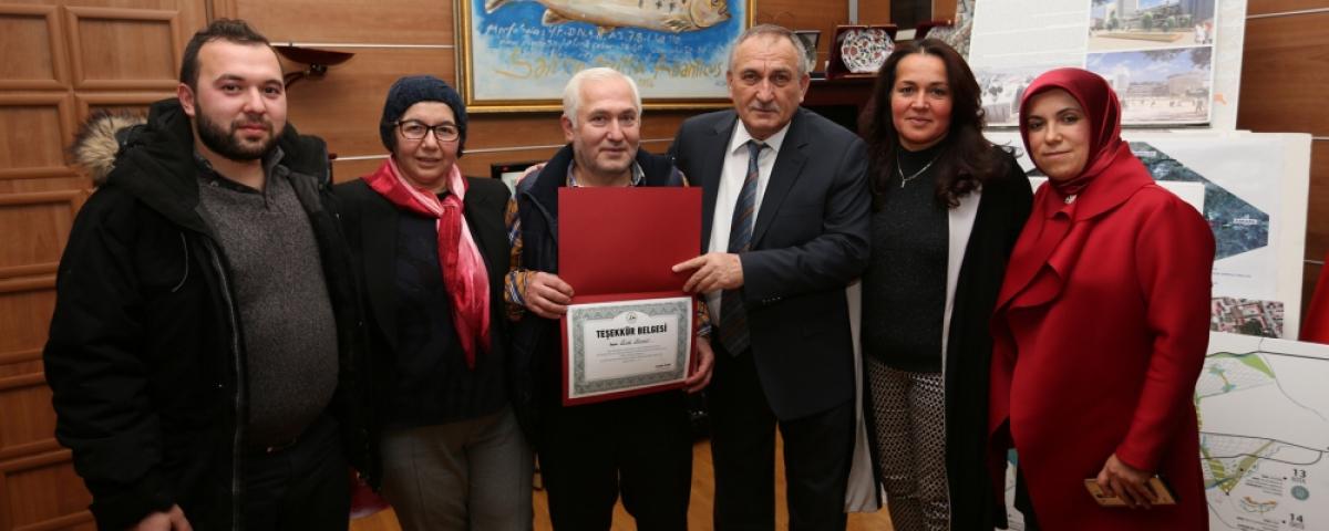 Bolu Belediye Başkanı Alaaddin Yılmaz, bağışta bulunan gurbetçi genç kızın ailesini makamında ağırlayarak, gurbetçi genç adına düzenlenen ‘teşekkür belgesini’ yakınlarına teslim etti. Başkan Yılmaz, cuma günü saat 17.00’de gerçekleşen buluşmada “Örnek davranışlarından dolayı kendilerini kutluyorum. Bu tür anlamlı davranışların tüm halkımıza örnek olacağı kanaatindeyim” diye konuştu. Kültür ve Sosyal İşler Müdürü Güler Mert’in de hazır bulunduğu ziyarette aile bireyleri de Belediye Başkanı Alaaddin Yılmaz’ı başarılı çalışmalarından dolayı kutladı.