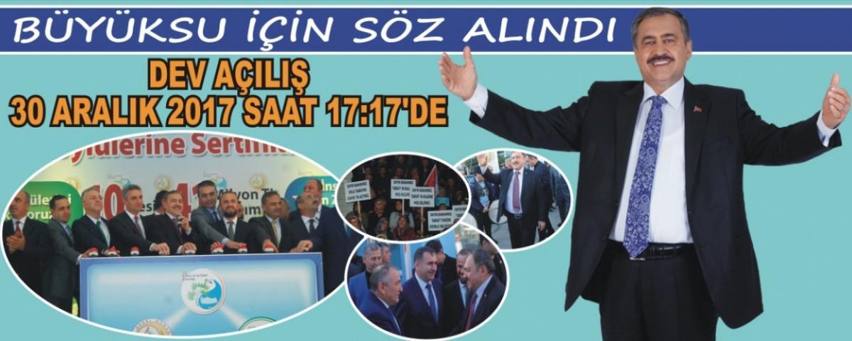 Orman ve Su İşleri Bakanı Prof. Dr. Veysel Eroğlu, yeni müjdelerle Bolu’ya geldi. Bolu Belediyesi’nin en büyük projelerinden biri olan Büyüksu Projesi’ne ayrıca önem verdiğini dile getiren Bakan Eroğlu, Büyüksu Projesinin müteahhidinden sahnede söz alarak projenin 30 Aralık 2017 saat 17:17’de bitirilmesini istedi. Müteahhit firma Baytimur İnşaat 2018 yılı yerine projeyi 30 Aralık 2017 saat 17:17’de bitirmek üzere taahhütname imzaladı.