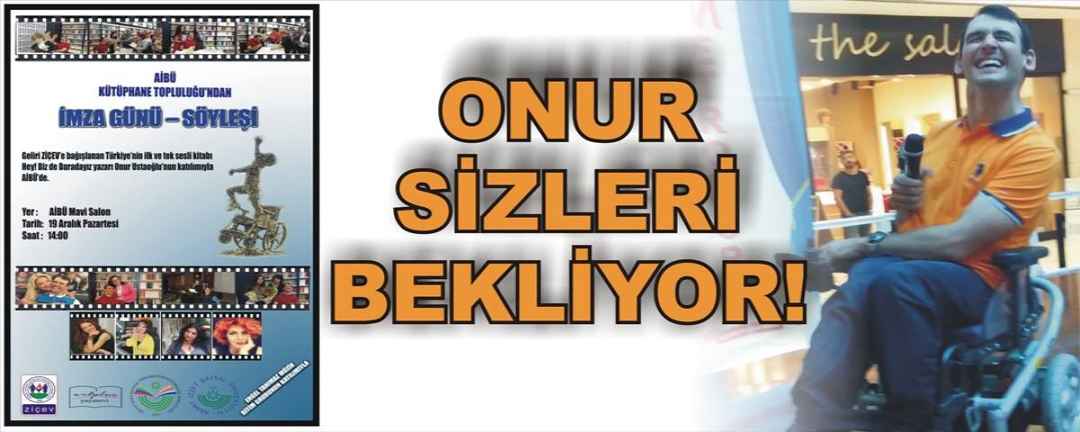 19 Aralık Pazartesi günü AİBÜ Mavi Salonda gerçekleştirilecek imza günüyle ilgili açıklamalarda bulunan Gazetemiz Köşe Yazarı Onur Ustaoğlu, “Ben Onur Ustaoğlu. Bolu Ekspres ve Takip gazetelerinde köşe yazarı, aynı zamanda Türkiye'nin ilk ve tek sesli kitabı ‘Hey! Biz de Buradayız!’ın yazarıyım.Geliri Zicev’e bağışlanan ‘Hey! Biz de Buradayız’ engelli bireylerin sorunlarına dikkat çektiğim, ünlü isimlerin de bulunduğu çok kalabalık bir ekibin bana eşlik etmesiyle seslendirerek ‘konuşturduğumuz’ ilk kitabım.Engelli bireylerin aslında toplum tarafından engellendiğini, doğru adımlarla aşılamayacak hiçbir engelin bulunmadığını anlattığım kitabım üçüncü imza gününü AİBÜ'de pırıl pırıl gençlerle birlikte yapıyor. Renkli bir sunumla zenginleştirdiğimiz imza gününe hem köşe yazarı bir arkadaşınız, hem de Bolulu bir kitap yazarı olarak hepinizi davet ediyorum” ifadelerini kullandı.