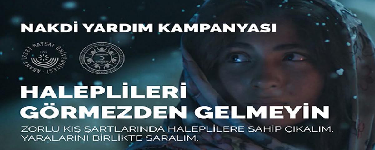 Topluluğun kampanya hakkında yaptığı açıklamada şöyle denildi: “AİBÜ Türk Kızılayı Topluluğu olarak Halep’te yaşananlara sessiz kalmamak ve şuan İdlib’de çadır kentte olan kardeşlerimize el uzatmak gayesiyle ‘Haleplileri Görmezden Gelmeyin’ başlığında bir yardım kampanyası başlattık. Bu kapsamda üniversiteli kardeşlerimizin yardım bilincini artırmak ve onların Halep’e uzanan elleri olmak adına 3,5,6 Ocak tarihlerinde Aktivite Merkezinde kuracağımız stantta nakdi yardım toplanacaktır. Tüm arkadaşlarımızı kampanyamıza destek olmaya bekliyoruz.”