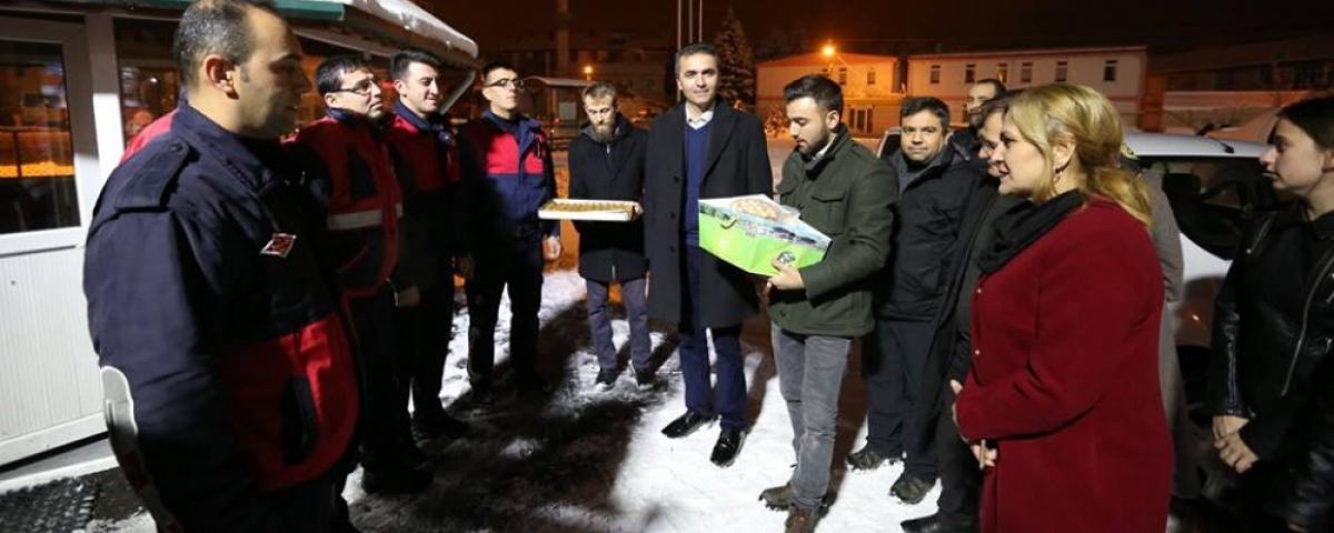 Ziyaretlere Belediye Başkan Yardımcısı Zerrin Biçen, İl Genel Meclisi Başkanı Yaşar Yüceer, Ak Parti İl Başkanı Nurettin Doğanay, Kadın Kolları Başkanı Arzu Aydın, Ak Parti Teşkilat Başkanı Mazhar Bozoğlu, Gençlik Kolları Teşkilat Başkanı Harun Yıldız katıldı. Geç saatlere kadar devam eden ziyarette Ak Parti İl Başkanı Nurettin Doğanay, “Yılbaşı nedeniyle bizim güvenliğimizi, sağlığımızı düşünen çalışanlarımız ailesinden, evinden uzakta görevlerinin başındalar. Hepsi yılbaşında, bayramda, her gün yoğun kar yağışı nedeniyle, zor şartlar altında görev yapıyorlar. Biz de bu gecede onları ziyaret ederek hal hatır sormak istedik. 2017 yılının ülkemize barış, huzur ve mutluluk getirmesini diliyorum” diye konuştu.