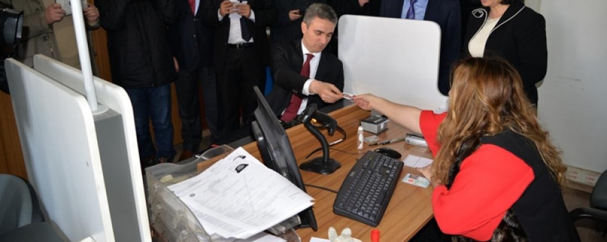 Bolu Valisi Aydın Baruş, Bolu Merkez İlçe Nüfus Müdürlüğü’ne giderek kimlik kartını ve 1 adet biyometrik fotoğrafını vererek çipli kimlik kartı başvurusunu yaptı. Yeni kimlik alımı için gerekli olan parmak izini sisteme yükledikten sonra diğer işlemleri de yerine getiren Vali Baruş, çipli kimlik kartlarının son derece güvenli olduğunu kaydetti. Yeni kimlik kartları alacak vatandaşlar için de olası uzun kuyruklar yaşanmaması için randevu sistemi ile de sıra alarak gelebileceklerini ve yeni kimliklerin dağıtımının 3 yıl boyunca süreceği bilgisini verdi. Kimlik kartı başvurusu ülkemiz genelinde olduğu gibi ilimizde de Nüfus ve Vatandaşlık Genel Müdürlüğü web portalı üzerinden ya da Çağrı Merkezi (Alo 199) aracılığıyla randevu alınarak veya randevusuz olarak nüfus müdürlüklerine yapılabilecek.