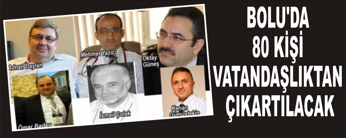 Bolu’da FETÖ’nün önde gelen isimlerinden olan yurtdışına kaçtığı tespit edilen ve haklarında yakalama kararı çıkartılan işadamları Adnan Daylan, Ömer Baday, İsmail Çolak, Cuma Kartal, İl Özel İdare eski Genel Sekreteri Oktay Güneş, AİBÜ eski Rektör Yardımcısı Kenan Gümüştekin, bir dönem AİBÜ Tıp Fakültesi’nde görevli FETÖ’nün lideri Fethullah Gülen'in kalp doktoru Prof. Dr. Mehmet Yazıcı'nda aralarında bulunduğu toplam 80 kişi yurda dönmedikleri takdirde vatandaşlıktan çıkartılacak.