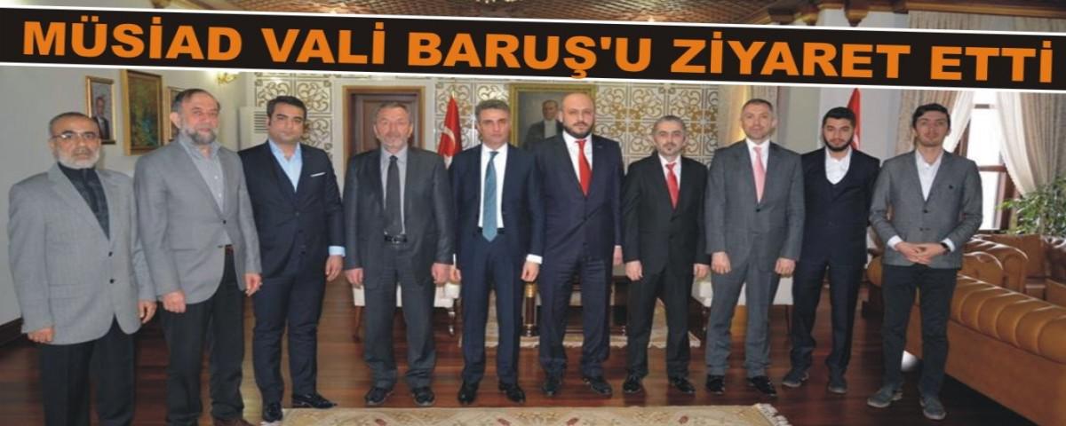 MÜSİAD Bolu yeni dönem Şube Başkanı Abdullah Abat ve Yönetim Kurulu Üyeleri Bolu Valisi Aydın Baruş’u makamında ziyaret etti. MÜSİAD Bolu yeni dönem Şube Başkanı Abdullah Abat ve Yönetim Kurulu Üyeleri Ali Abbas Açıkol, Ali Sağol, Ayhan Eren, Davut Uzun, Erkan Bozacı, Şaban Kök, Talip Özcan ve Genç Müsiad Bolu Başkanı Mehmet Aydın'ın katılımları ile birlikte Vali Aydın Baruş, ziyaret edilerek yeni dönem Yönetim Kurulu takdim edildi. Tanışma akabinde Vali Aydın Baruş’a yeni dönemde planlanan çalışmalar hakkında şube başkanı Abdullah Abat tarafından bilgi verildi. Vali Baruş Bolu’nun Marka Şehir olması gerektiğini ve bu yönde sivil toplum kuruluşlarına büyük görevler düştüğünü vurguladı. MÜSİAD Üyelerine yapılan ziyaretten dolayı duyduğu memnuniyeti dile getiren Vali Baruş, yeni yönetim kuruluna çalışmalarında başarılar diledi.Elif Erdoğan