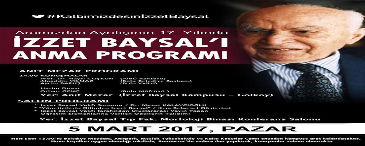 Bolu'nun mimarı büyük hayırsever iş adamı İzzet Baysal'ın aramızdan ayrılışının 17. yılında her yıl olduğu gibi mezarı başında anma programı düzenlenecek. 5 Mart Pazar günü İzzet Baysal’ın Abant İzzet Baysal Üniversitesi Gölköy Kampüsünde bulunan Anıt Mezarında düzenlenecek programın detayları belli oldu.